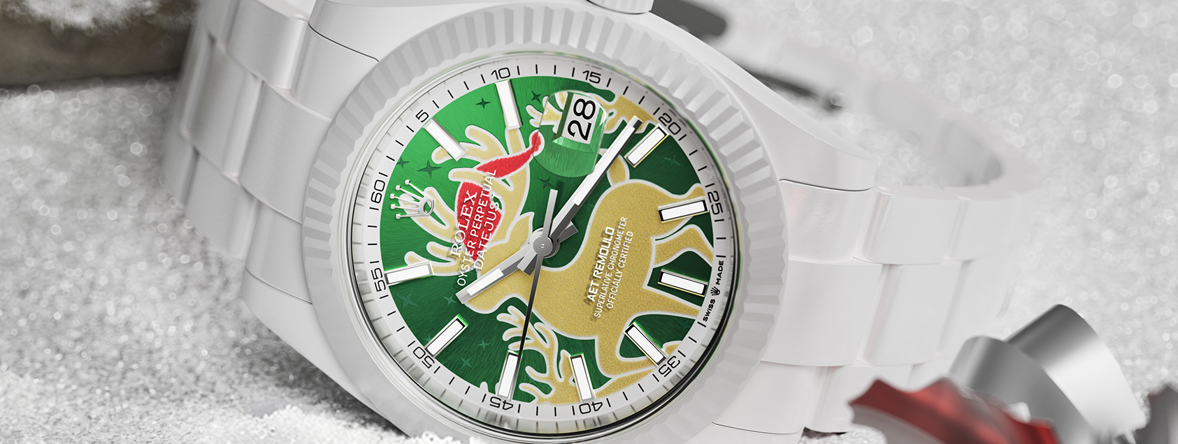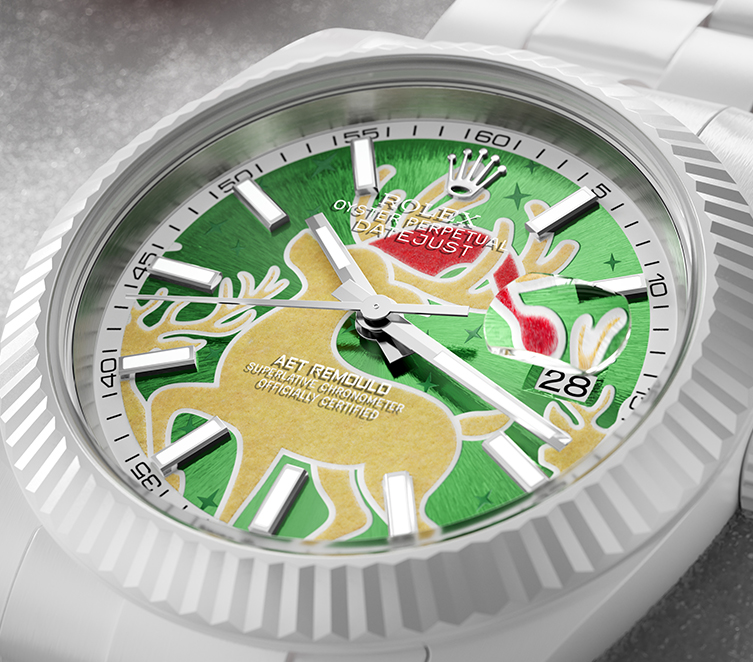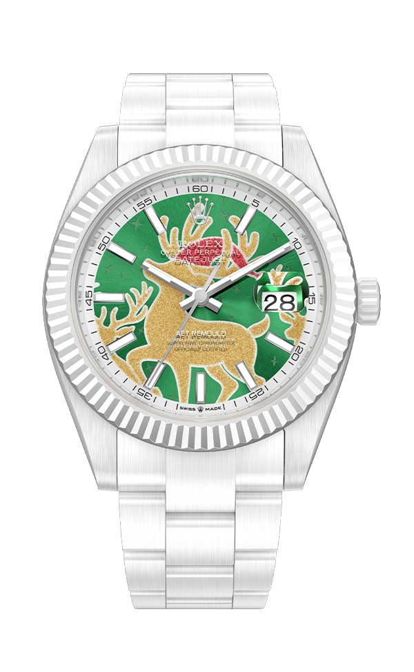 AET REMOULD 的设计师被这历经两个世纪依然打动人心的故事所启发,特别打造了这款圣诞特别版腕表。表盘中央的驯鹿以灵动之姿,诠释着圣诞守护者的优雅气韵,在精致的太阳纹背景映衬下,驯鹿仿佛置身极光之中,随光线变幻出耀眼的色彩流动。