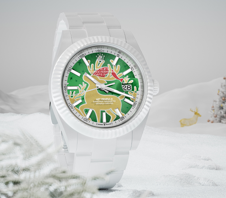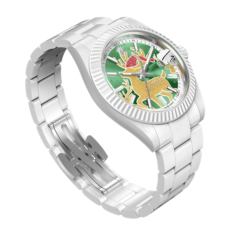 设计师巧妙地为驯鹿点缀了一顶红色圣诞帽,这一经典圣诞配色在绿色表盘的映衬下格外醒目,仿佛诉说着圣诞节的欢愉与温暖。而翠绿色的表盘底色汲取自圣诞树,与金色驯鹿形成鲜明对比,在为传统圣诞色注入全新设计灵感的同时,也展现出了别具一格的节日气息。