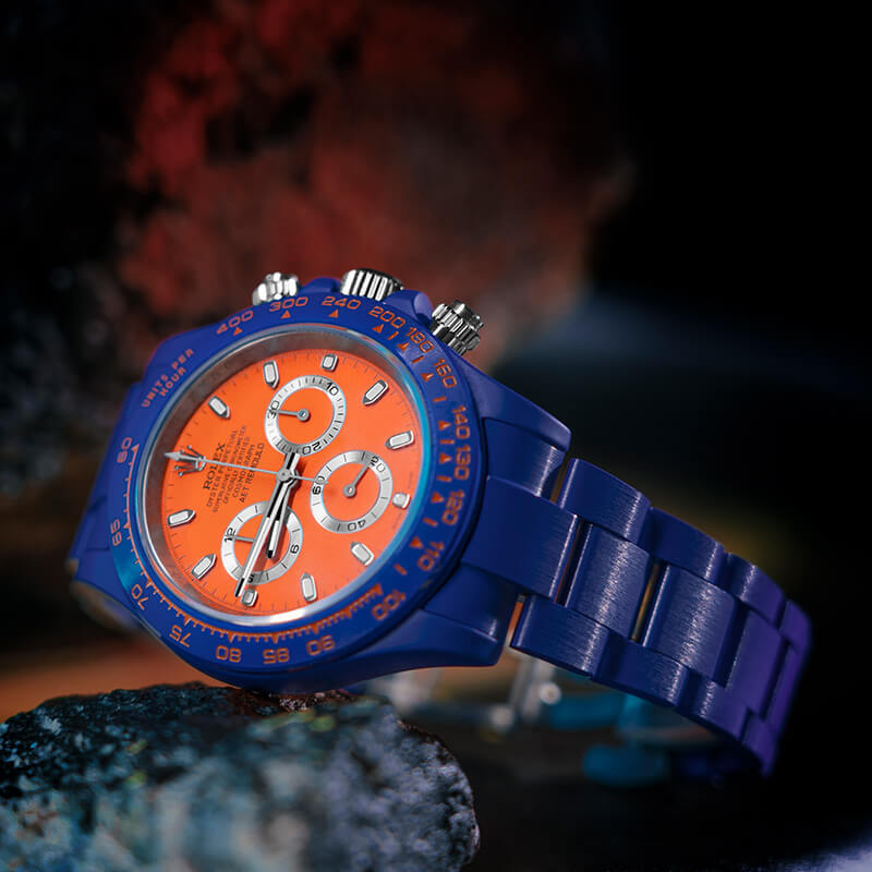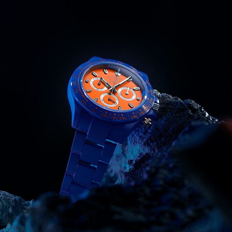AET REMOULD以“赛车运动”为设计概念,基于迪通拿打造了全新杰作。设计灵感源自萨基尔赛道两边的橙色路肩,设计师将这一标志性颜色与腕表设计相结合,传递出赛车运动的速度与激情。